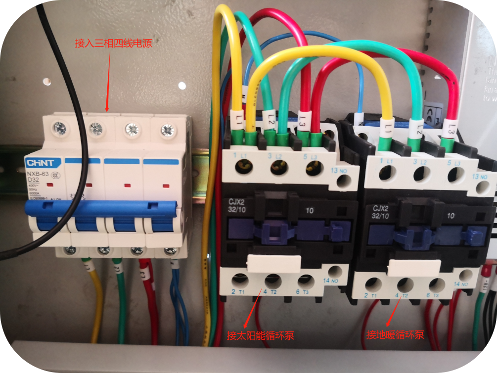 如下圖所示,安裝指示標(biāo)識正確接入線路,空氣開關(guān)依線號接入三相四線電源,交流接觸器輸出端分別接太陽能循環(huán)泵和地暖循環(huán)泵。